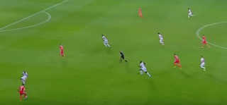 Salvio progride pelo corredor central, apesar de Vukcevic conseguir recuperar, passa por ele e apesar de ter espaço no meio para progredir e fixar os adversários, opta pelo passe para a esquerda para Jimenez no pé.